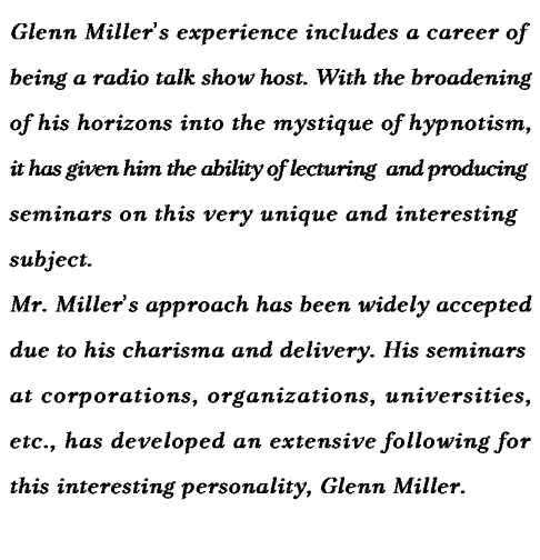 or email Glenn at glennmillerhypnosis@yahoo.com.